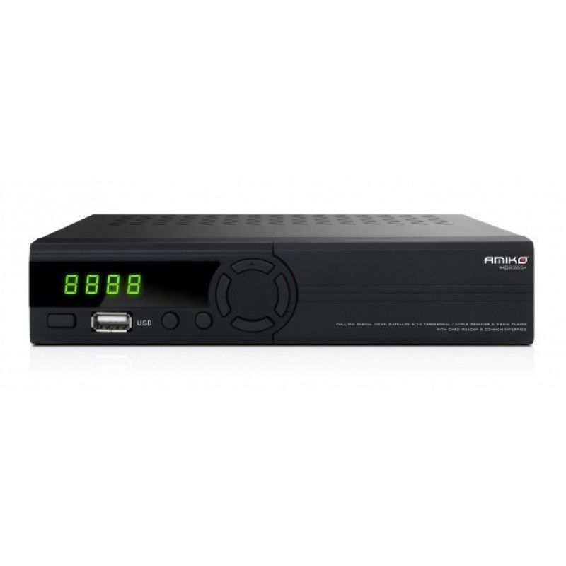 Receptor Combo Amiko HD 8265 + cu Conax încorporat, Common Interface și tunere DVB-S2 & DVB C/T2 și poate să fie folosit cu cartele Focussat, Freesat, Tivusat ș.a.m.d.